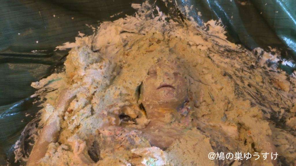ケーキを女の子の上でぐちゃぐちゃにしていくと、スポンジケーキと生クリームが混ざり合い独特の硬さのクリームが完成
