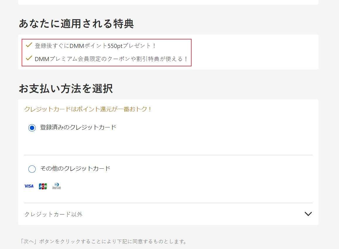 ※FANZAで会員登録する時にクレジットカード登録してあると、登録済みのクレジットカードを選べます。